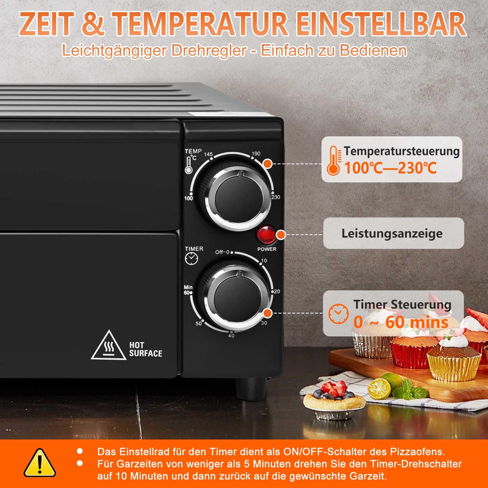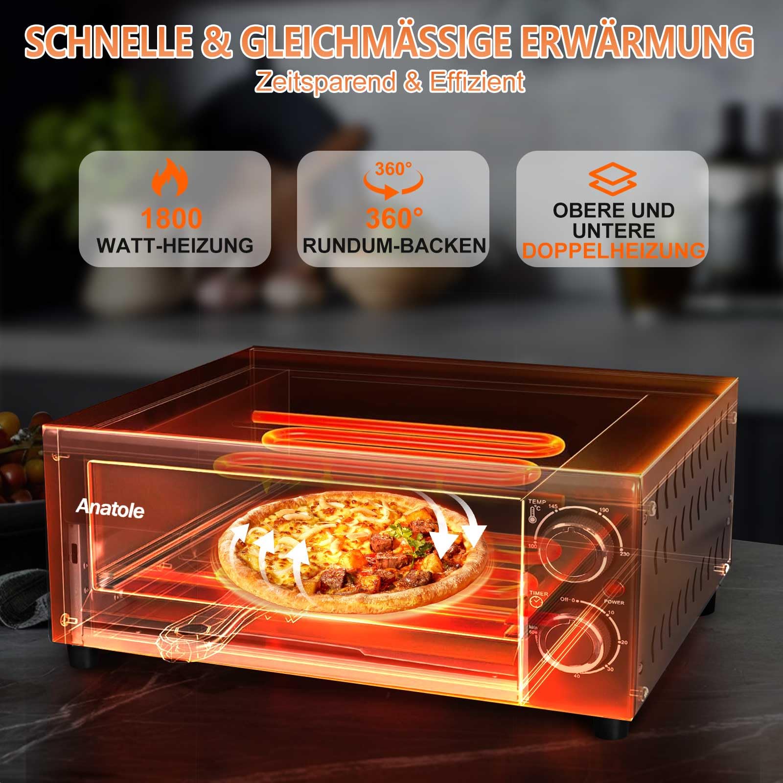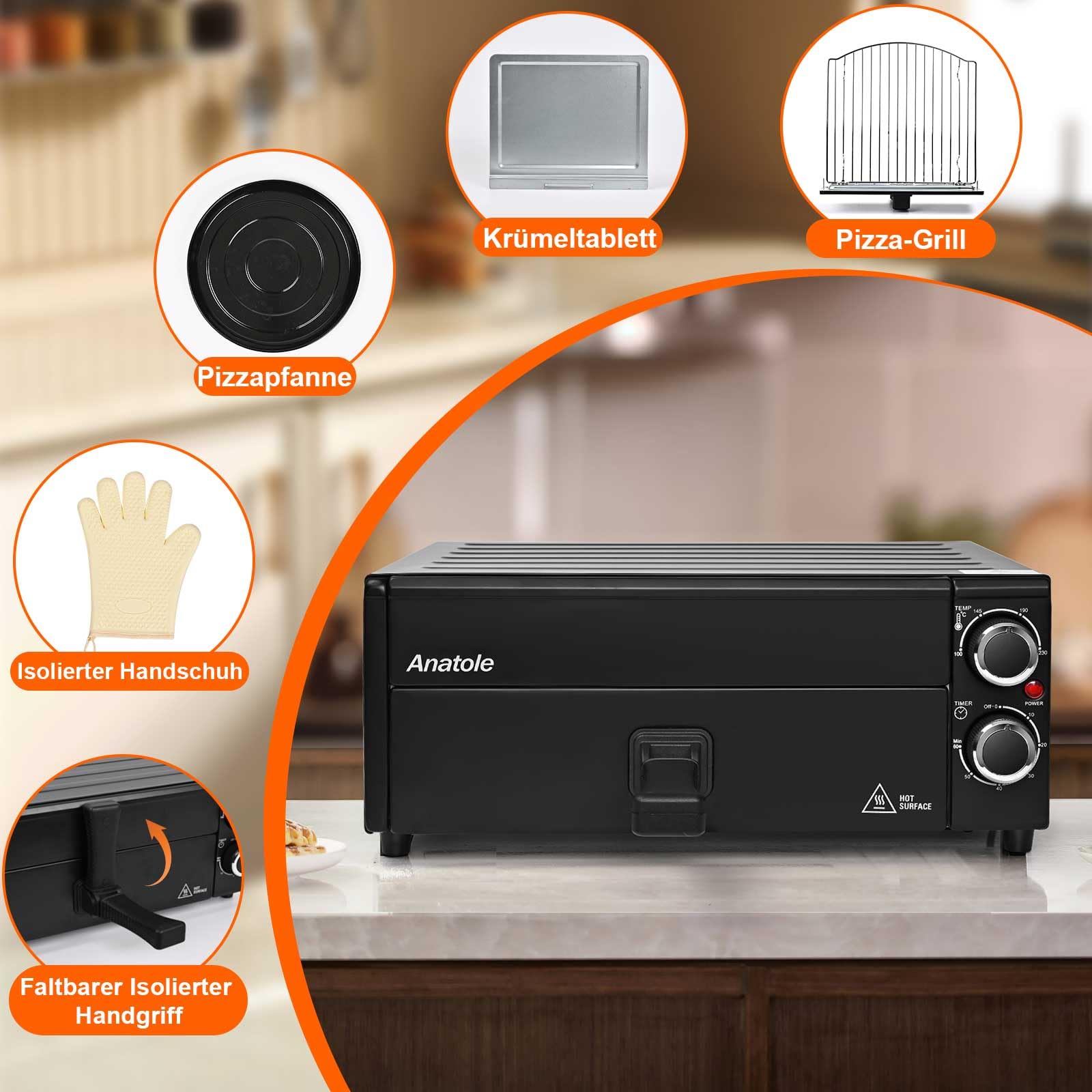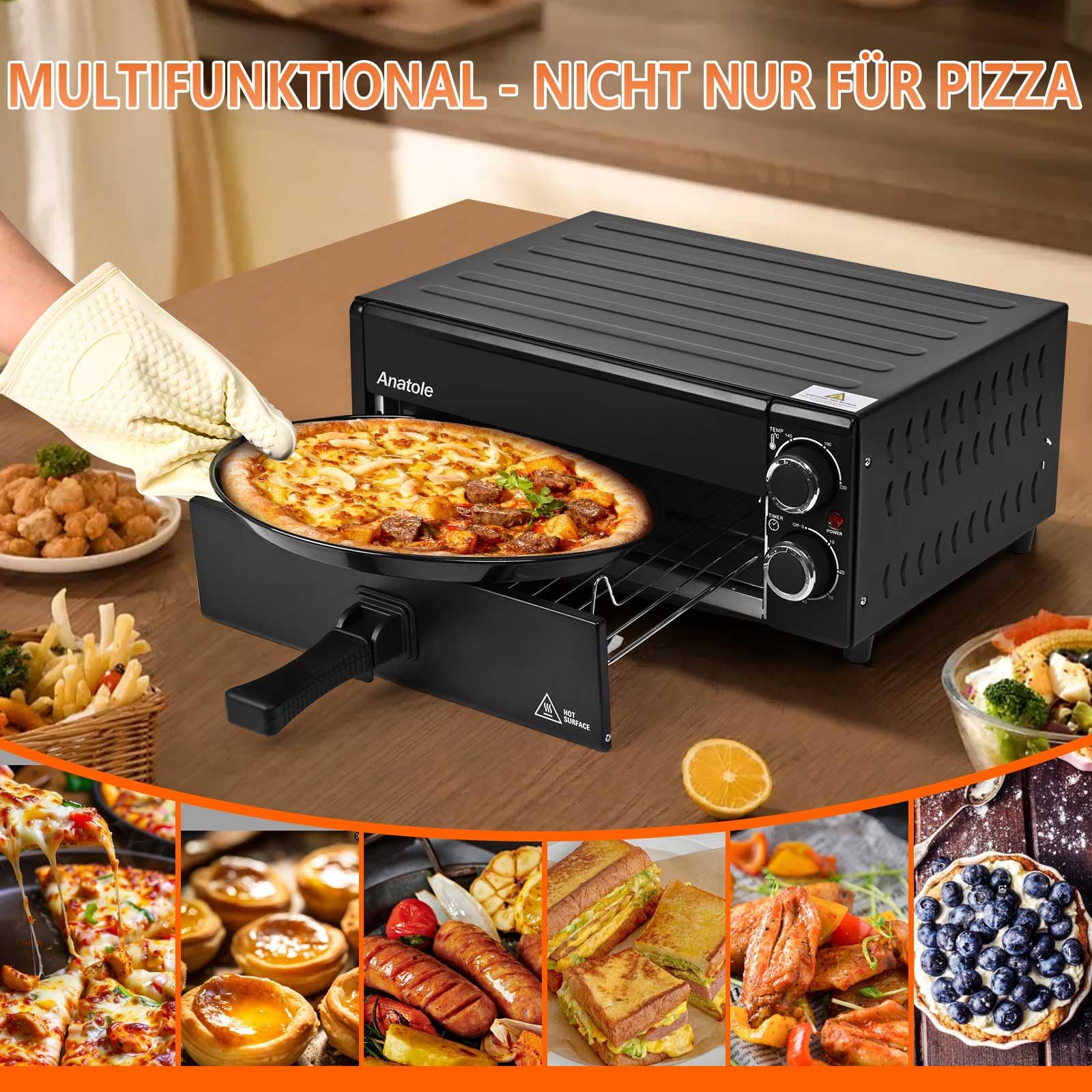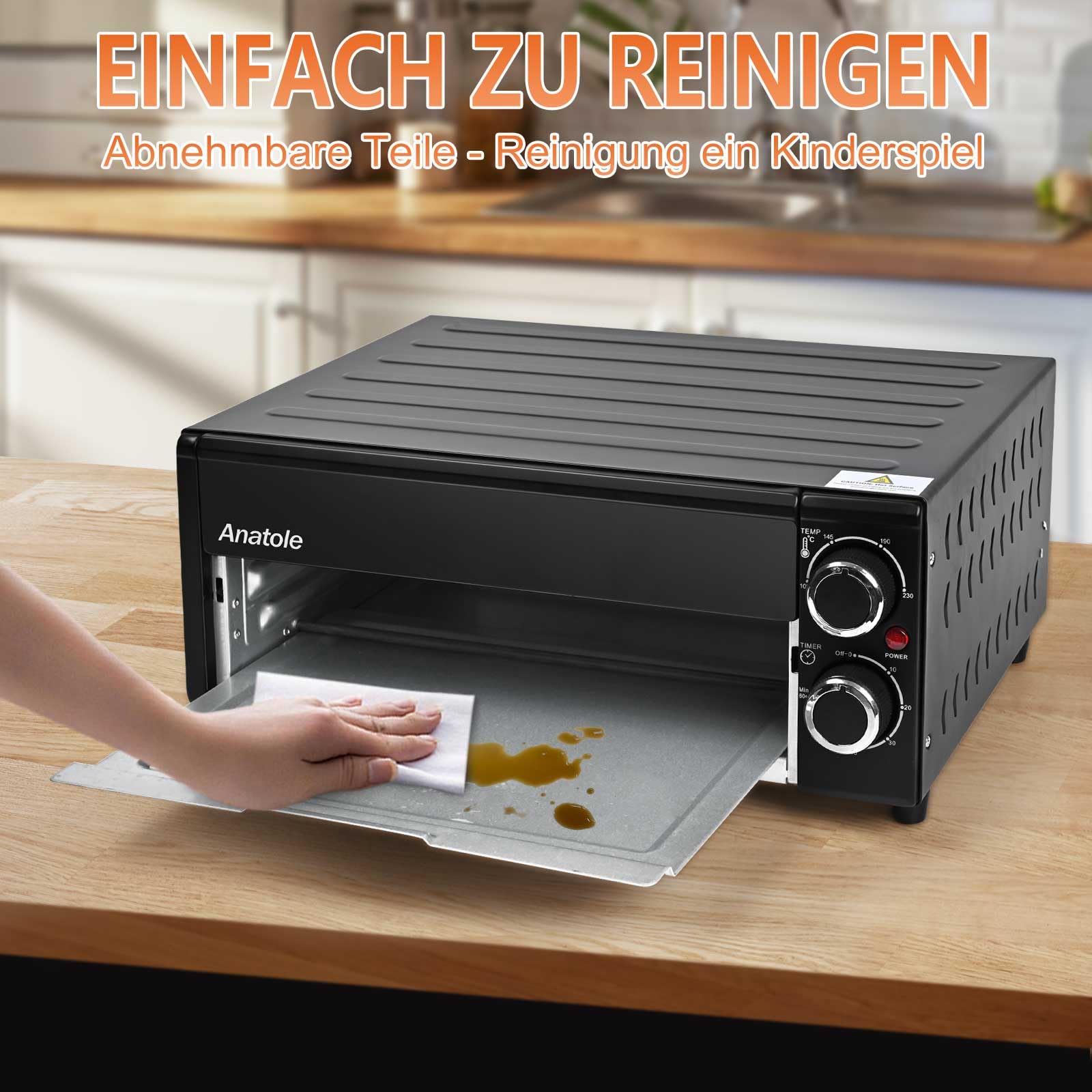 Anatole Pizzaöfen Elektrisch 12" 1800W Pizza Maker Indoor Zeit Temperatur Einstellbar Pizzamaschine Multifunktional mit Abnehmbar Grill Krume Tray