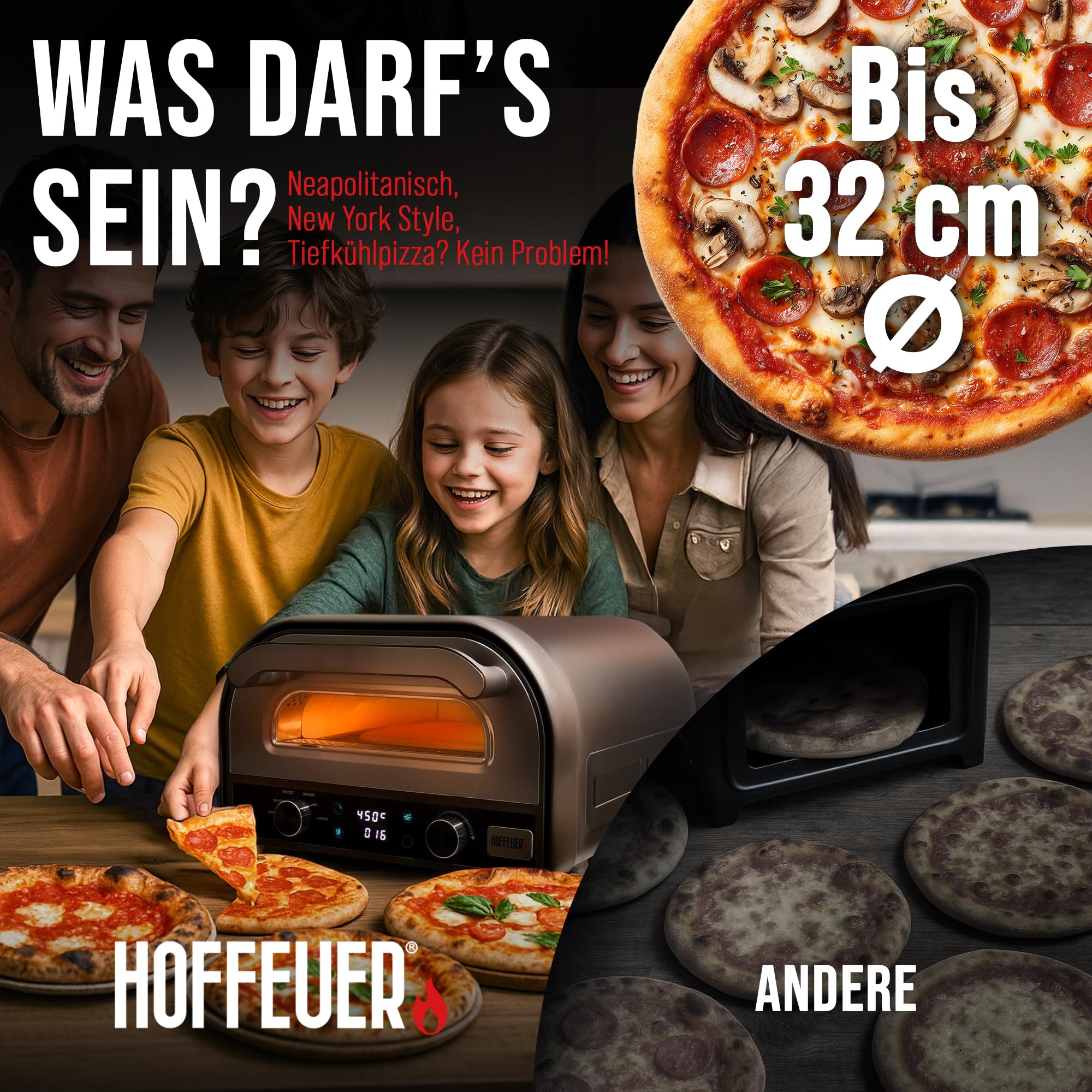 HOFFEUER Pizzaofen elektrisch β Profi Elektro-Pizza Ofen fΓΌr Zuhause mit Pizzastein, Drehfunktion & ZubehΓΆr | Pizza wie aus dem Steinofen, Flammkuchenofen | Elektrischer Pizzamaker | Grill Oven